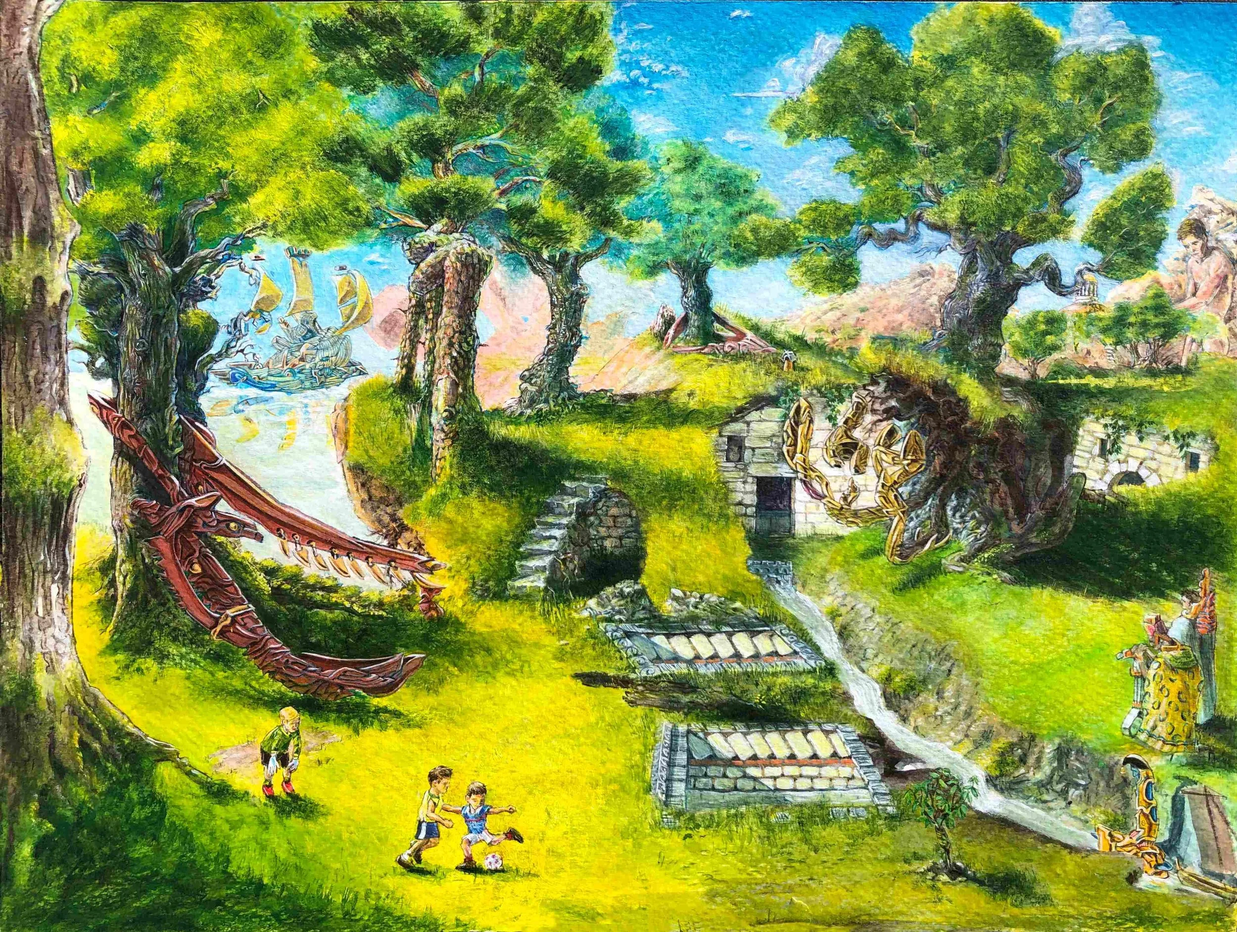 Saint louis rendant la justice sous un chêne, 2023, acrylique sur papier Arches, 24x32 cm.